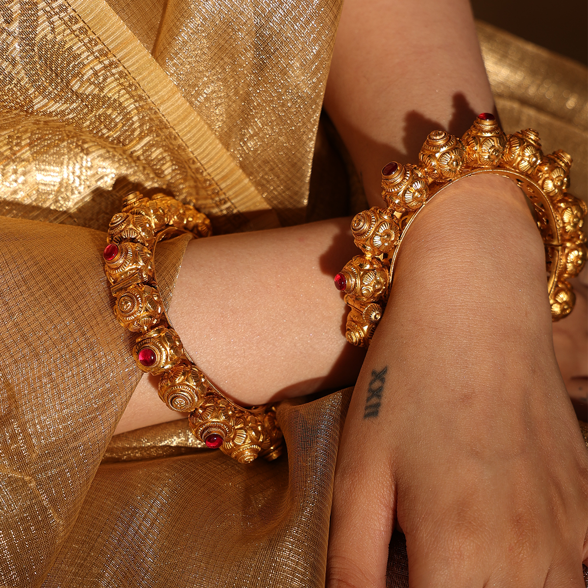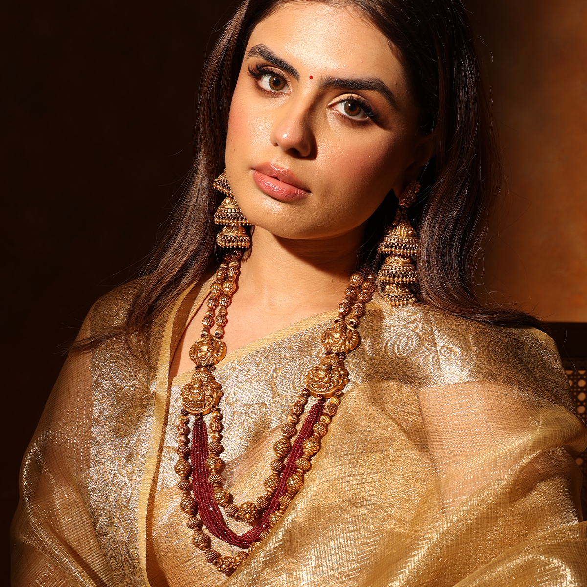 Each piece of Ribbons temple jewellery is a visual hymn. Intricate depictions of Lakshmi, Ganesha, and other revered deities are surrounded by traditional motifs The design language speaks to devotion, prosperity, and protection, making it ideal for auspicious occasions and spiritual adornment.